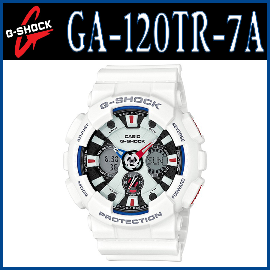 G-SHOCK(ジーショック)CASIO(カシオ)腕時計 GA120TR-7A(ベースカラー:白色)タフネスを追求し進化を続けるG-SHOCKから、ホワイト・レッド・ブルーの鮮やかな配色「Tricolor Series(トリコロール・シリーズ)」が登場。ベースモデルにはタフネスデザインのGA-120を採用。ファッションアイテムに用いられる小物などをデザインモチーフに、アクセントカラーのトリコロールを随所に施したデザインに仕上げました。カジュアルファッションシーンで活躍するNewモデルの登場です。 国内モデル品番:GA-120TR-7AJF BIG CASE シリーズ