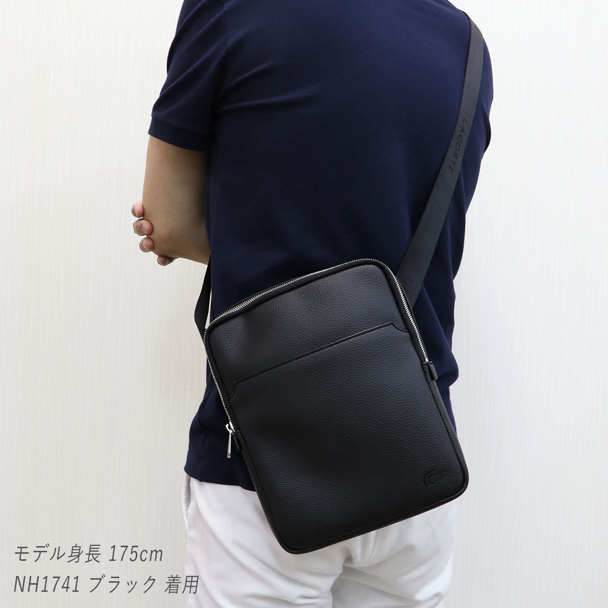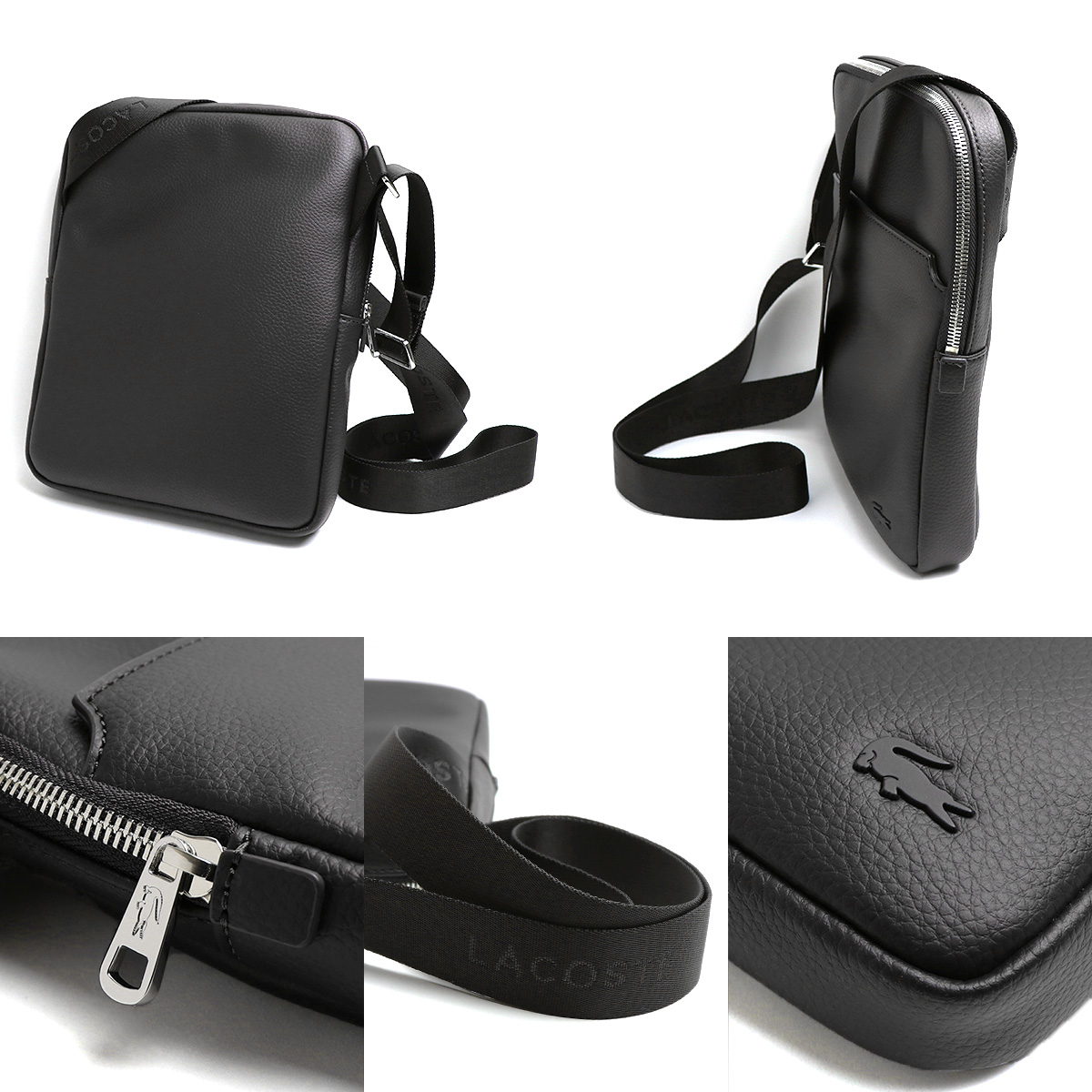LACOSTE ラコステ ショルダーバッグ NH1741 ブラック 黒 ワニ クロコダイル 斜めがけ マチなし 薄型 ミニショルダー 通勤 カバン 鞄 軽量 ななめがけ ワンショルダー レザー調 メンズ 男性用 ギフト