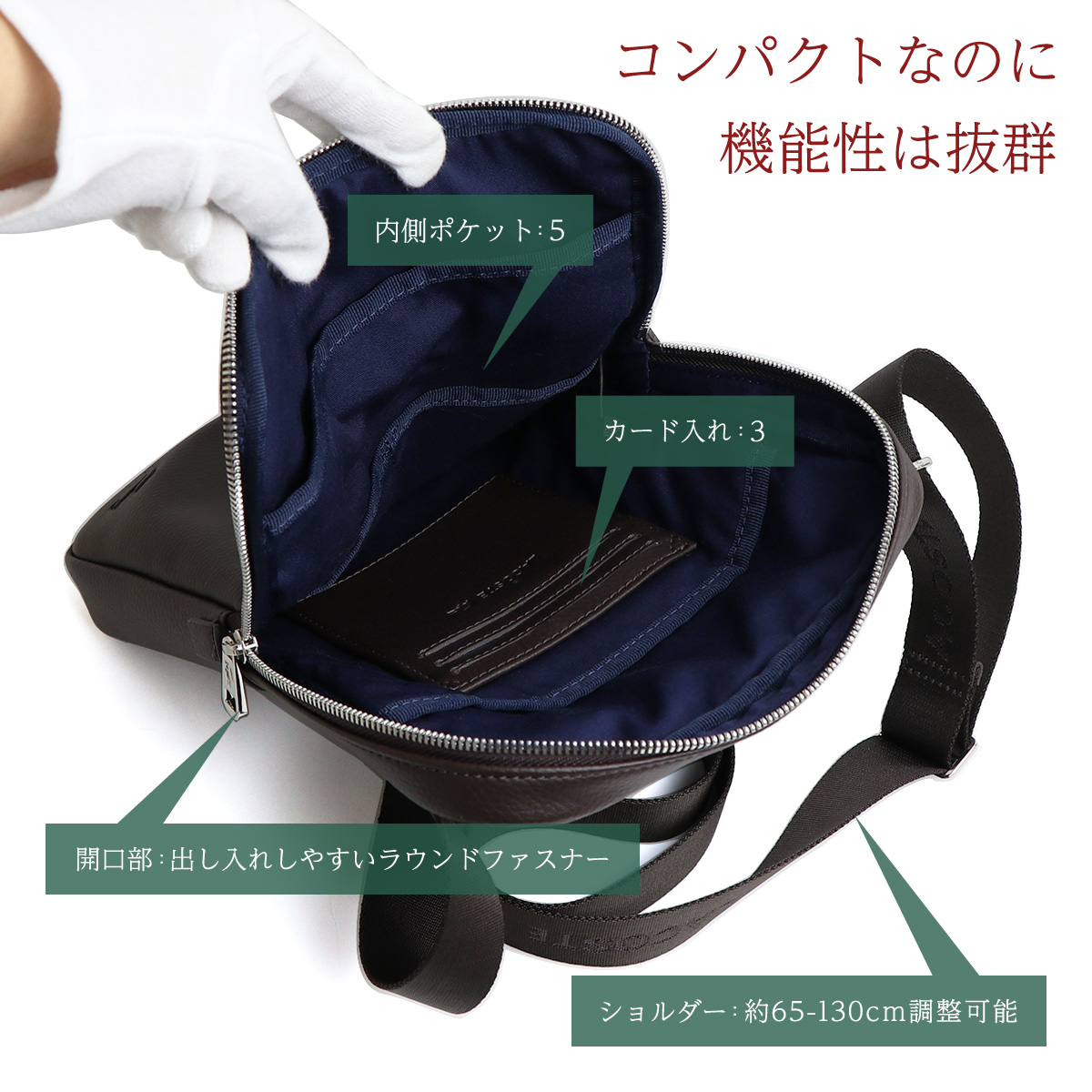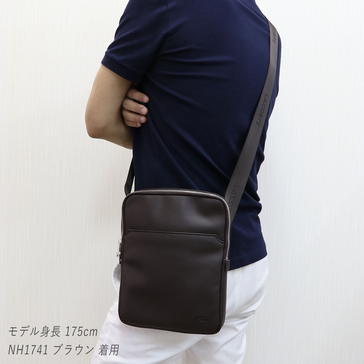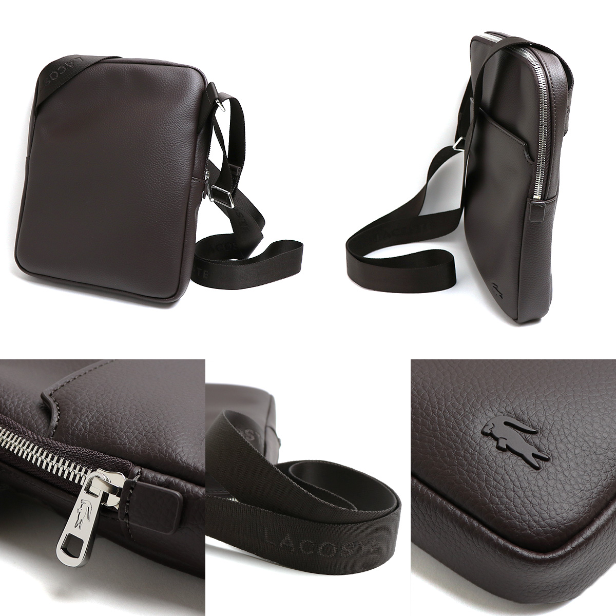 LACOSTE ラコステ ショルダーバッグ NH1741 ダークブラウン ワニ クロコダイル 斜めがけ マチなし 薄型 ミニショルダー 通勤 カバン 鞄 軽量 ななめがけ ワンショルダー レザー調 メンズ 男性用 ギフト